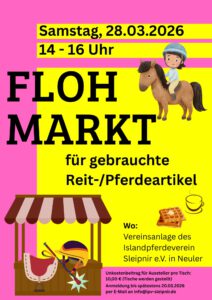 Wir veranstalten am 28. März 2026 bei uns im Vereinsheim einen Pferdeflohmarkt für alle gebrauchten Reitsachen. Der Flohmarkt ist offen für Vereinsmitglieder, aber auch Nicht- Vereinsmitglieder sind herzlich Willkommen!!